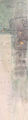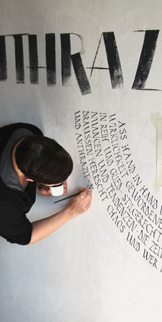 Nur selten benutze ich Schriftvorlagen. Mein Ziel ist nicht ein weißes Blatt mit perfekt kopierten, aneinandergereihten Buchstaben. Selbst wenn ich mit einer Schriftvorlage beginne zu üben, werde ich sehr schnell ungeduldig, rolle ein paarmal mit den Augen, lege die Vorlage weg, schreibe einfach drauf los und heraus kommt etwas, das irgendwie an eine klassische Schrift ‚mit Namen und Titel‘ erinnert, aber gleichzeitig anders ist. Letztendlich macht für mich erst dann alles einen Sinn, wenn man seinen eigenen Impulsen folgt. Gleiches gilt für die Planung von Werken. Ich bin keine Theoretikerin und habe von Materialkunde, Schreibtechnik und klassischer Schriftkomposition so viel Ahnung wie von Atomphysik. Richtig glücklich bin ich erst, wenn ich bis zu den Ellbogen in Farbe, Leim und Tusche stecke, meine Lieblingsmusik höre und einfach mal gucke, was passiert.