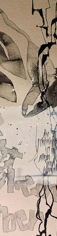 Gerade bei kreativen Arbeiten hindert mich das Denken enorm. Ich sehe es meinen Werken an, wenn sie Kopfgemüse sind. Sie wirken dann so konstruiert. Das Bild „LICHT“ in dieser Ausstellung ist so eines. Im Grunde genommen kompositorisch völlig ok – aber so furchtbar clean gestaltet… Gerade deshalb hänge ich es auf. Dahingegen wirkt das lange Bild „Das Leben ist durchaus nicht so konsequent“ sehr organisch, wie Moos, das sich über einen Stein verteilt – so, als wäre es langsam gewachsen. Und tatsächlich ist dieses Werk in vielen kleinen Einzelhandlungen entstanden. Schritt für Schritt – ohne jeweils den nächsten zu kennen. Von Anfang her hatte ich absolut kein Bild vom Endziel – oder wie es „geschehen“ soll…